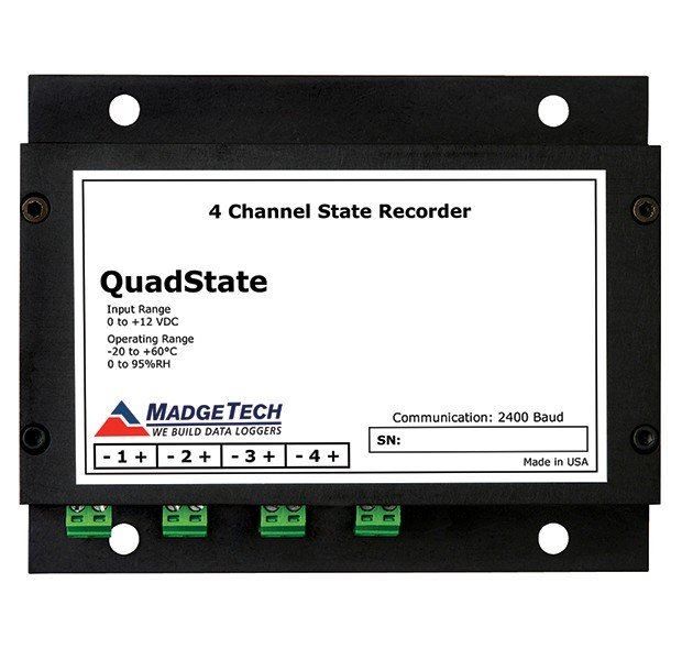 The QuadState is a four channel, battery powered, stand alone state change data logger. The device records time and date stamped, ON and OFF state changes for equipment run-time, usage and event duration data. It can be used with dry contact relay switches or analog voltage input signals to determine changes in status and open/closed contacts.